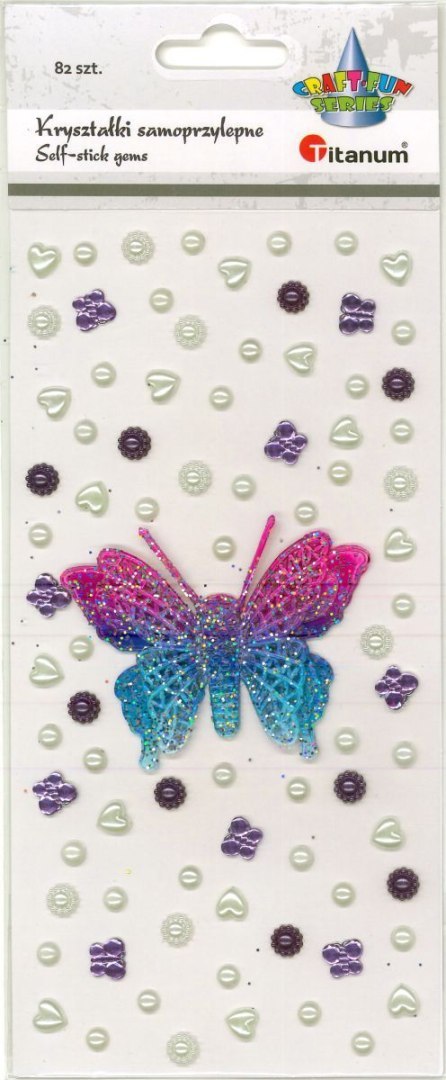 Kryształki samoprzylepne, wzory: motyl 3D 75 x 60 mm, motyle akrylowe 10 x 8 mm, kwiatki średnica 7 mm, perełki serca 8 x 8 mm, perełki średnica 5,5 mm, kolory: fioletowe, białe. 82 sztuki.