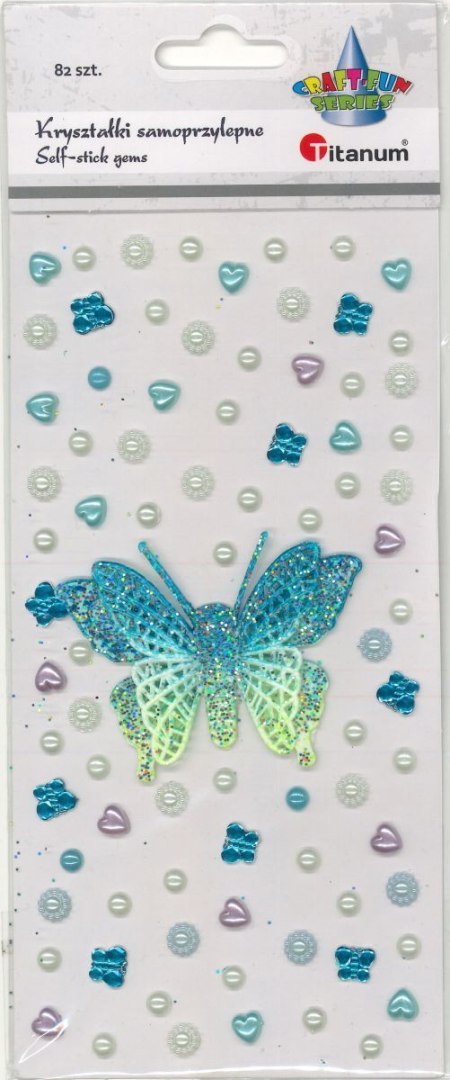 Kryształki samoprzylepne, wzory: motyl 3D 75 x 60 mm, motyle akrylowe 10 x 8 mm, kwiatki średnica 7 mm, perełki serca 8 x 8 mm, perełki średnica 5,5 mm, kolory: turkusowe, błękitne, różowe, białe. 82 sztuki.