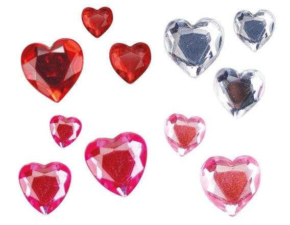 Kryształki samoprzylepne, wzór: serca, wymiary: 6x6/8x8/10x10/12x12 mm, kolory: czerwone, różowe, srebrne. 40 sztuk.