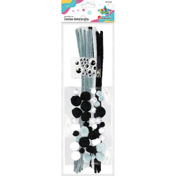 Zestaw: druciki, pompony, oczka, tonacja: odcienie szarości. 80 szt.